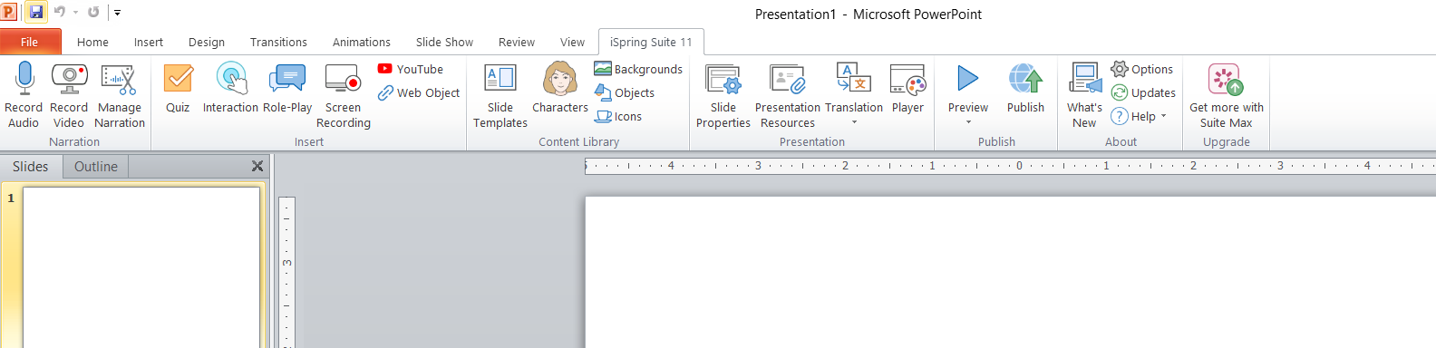 Để bắt đầu bài giảng mở PowerPoint và thực hiện soạn bài giảng trên phần mềm này như bình thường. Hoặc bật iSpring Suite chọn Course => chọn New Courses đều sẽ hiện lên giao diện khi tạo một bài thuyết trình mới trên PowerPoint với các công cụ của iSpring được tích hợp.