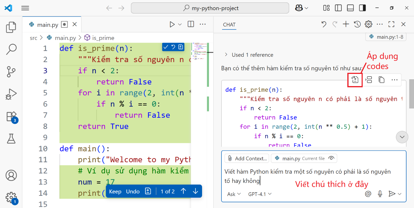Khi sinh viên bắt đầu khai báo một hàm hoặc viết một chú thích ngắn mô tả yêu cầu bài toán, Copilot có thể tự động đề xuất đoạn mã phù hợp với ngữ cảnh. Điều này giúp giảm bớt những lỗi cú pháp không cần thiết và cho phép người học tập trung nhiều hơn vào việc hiểu bản chất thuật toán.